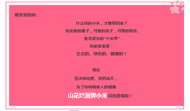 為了咱家人的健康,興縣山花爛漫牌小米只施天然有機肥,決不讓一粒化肥進農(nóng)田,絕不使用殺蟲劑、除草劑,人工種植、人工除草、人工收割,24小時追溯系統(tǒng)管理,粒粒小米精選,高品質(zhì)的保證!